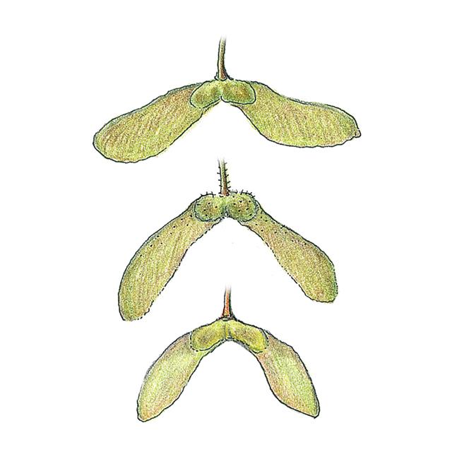 단풍나무속 식물의 열매. 단풍나무 열매(위에서부터)는 수평에 가깝게 벌어지며, 복자기나무와 당단풍나무는 열매가 직각 정도로 벌어진다.
