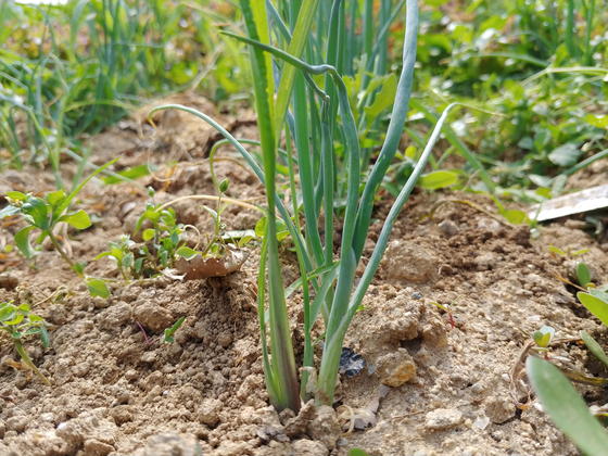 대파 옆에 바랭이가 붙어있다. 얼핏 보면 비슷하게 생겼다. 교묘한 위장술로 빌붙어 살려는 속셈인데 딱 걸렸다. 친구들 괴롭히고 '삥'뜯는 일진 애들과 다름없다. 뽑아서 뿌리를 뒤집어놨다.