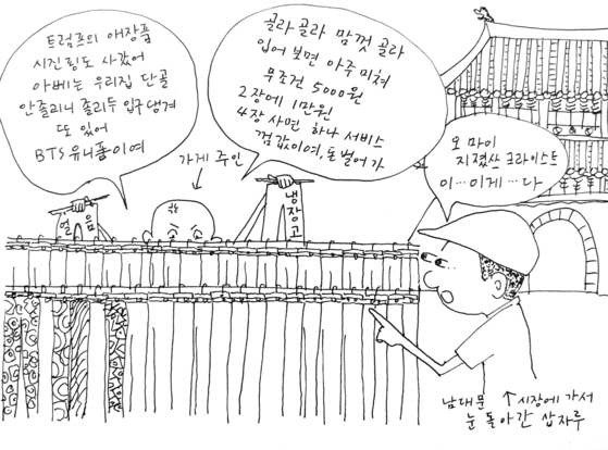 올 들어 날 더워지니 몇 개 더 마련해야겠다는 욕심이 들었다. 일주일 전 해질 무렵 숭례문시장에 갔다. 노점들이 거리를 메우고 있었지만 새벽부터 문 연 가게들은 셔터를 내리기 시작했다. 생각대로 웬만한 가게들은 다양한 상품을 갖추고 있었다. 1년 새 간이 커져 이번에는 노랑 파랑 빨강 꽃무늬가 들어간 총천연색 바지를 찾았다. 그런데 이런, 아저씨용은 회색이나 검은색 계통이 90%였다. 군대 향수에 기댄 마케팅인지 국방색도 보였다. (미안하지만 군대 분위기 좋아하는 아저씨 많지 않다. 술자리에서 날아다니는 군대시절 무용담은 허풍과 거짓말이 절반이다.)